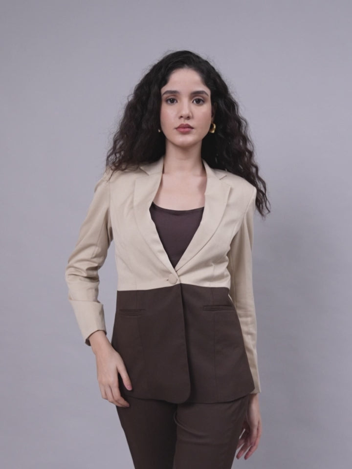 Beige & brown colorblock suit set featuring a structured single button closure paired with straight fit trousers.