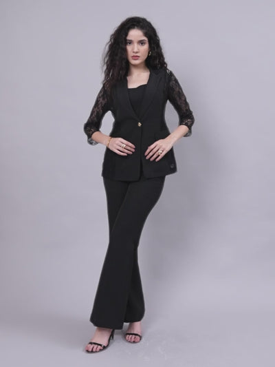 This elegant black co-ord set blends modern tailoring with delicate lace sleeves and side panel/back, featuring a sleek blazer with a single gold button and straight-fit trousers with a camisole 3pc set — a perfect balance of power and femininity for any occasion.