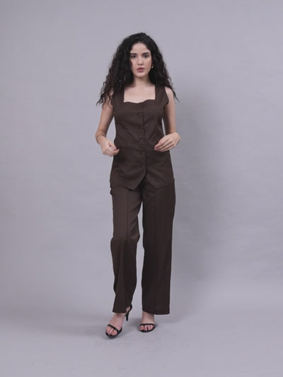 Stretch Brown Sleeveless Co-Ord Set with Tailored Button-Down Top and Semi-Flared Trousers