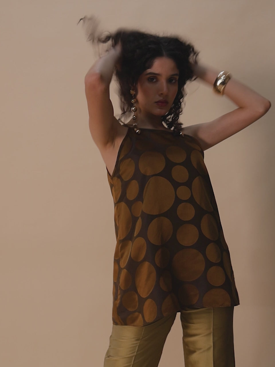 Exude elegance with this copper-brown halter neck top, adorned with timeless polka dots. Crafted from pure silk, it offers a luxurious feel and a chic silhouette, perfect for elevating your evening or party look.