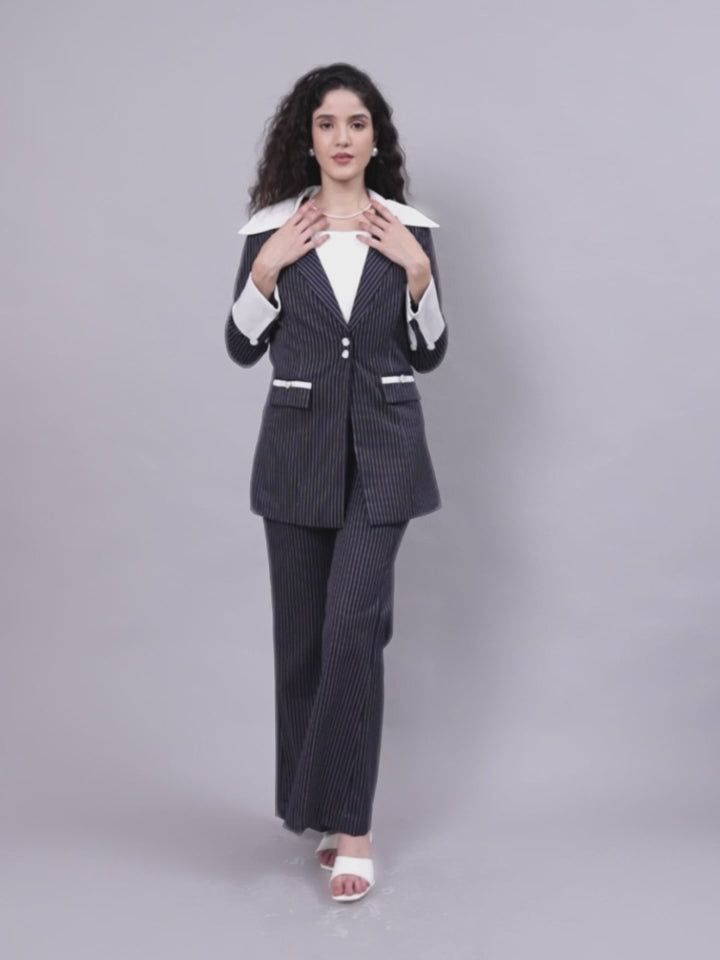 Chic navy pinstripe co-ord set featuring a contrast white collar and cuffs, paired with tailored wide-leg pants for a bold power-dressing statement.