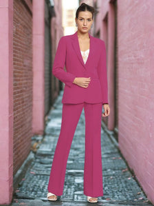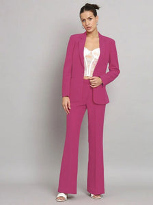 Make a bold statement with the Notch Collar Stretch Blazer & Bell Bottom Pant Suit in Hot Pink. Featuring a tailored blazer with a sleek notch collar and flattering bell-bottom trousers, this suit exudes confidence, style, and elegance.