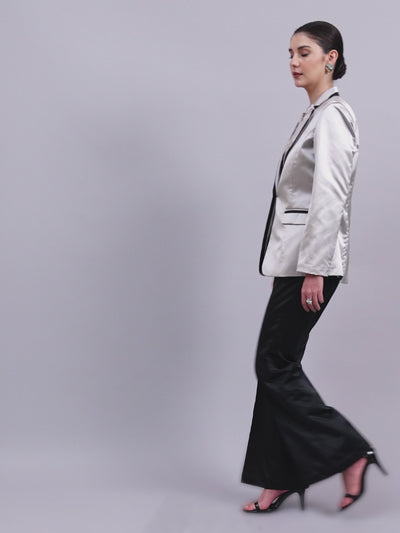 Make a sleek statement with this silver satin blazer paired with black trousers. The blazer features a sharp tailored fit with contrasting black lapel and pocket detailing, adding a modern edge to your formal look. Perfect for evening events, parties, or power dressing with a touch of luxury.