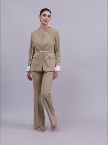 Effortlessly chic in a beige Stretch Pantsuit, featuring clean white piping details and relaxed tailoring that blends sophistication with ease — perfect for refined everyday dressing.