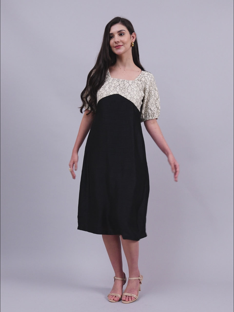 Turn heads with this elegant black midi dress featuring a vintage-inspired floral bodice and a flattering empire waistline. The puff sleeves and structured neckline add a touch of sophistication, while the flowing silhouette ensures a graceful finish. Perfect for evening soirées, date nights, or special occasions.
