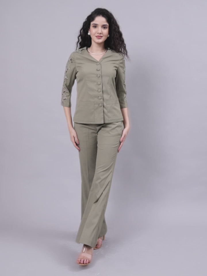 Sage Green Stretch Co-Ord Set Featuring Button-Down Top and Loose-Fit Trousers