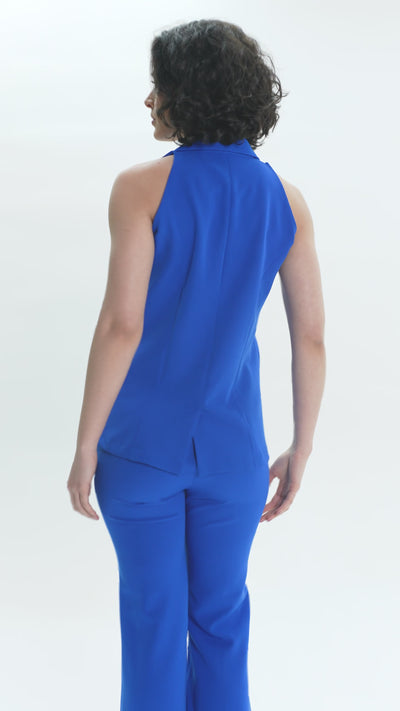 This women's halter vest co-ord set features a fitted waistcoat with fancy buttons and sharp pointed collars, paired with tailored bell-bottom trousers for a striking silhouette. Crafted from stretchable fabric, it offers both comfort and high-fashion appeal.